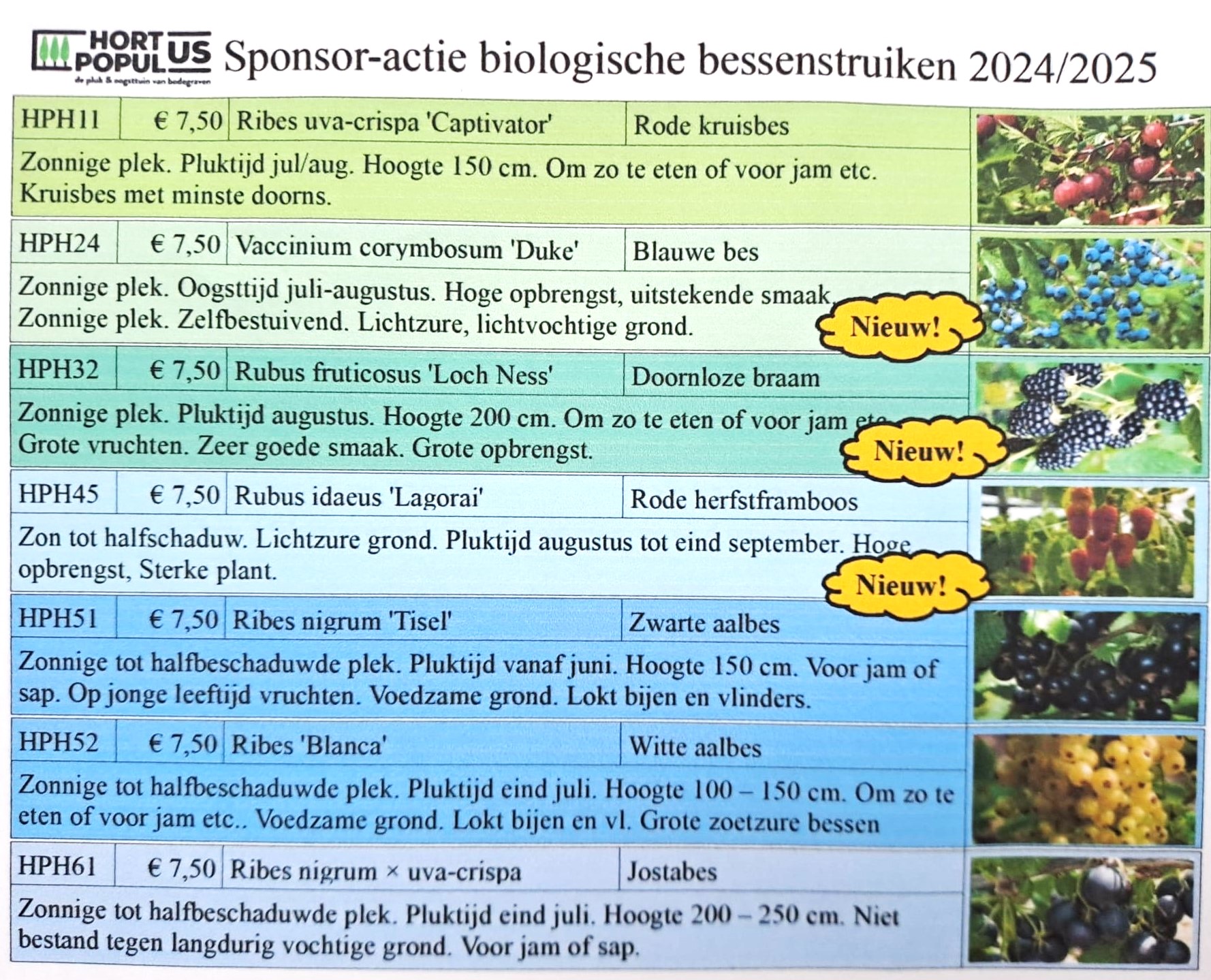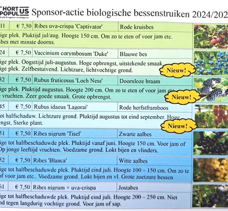 Deze staan in en pot en kunnen daardoor zonder bestelling worden gekocht. De overige struiken en de bomen staan op kale wortel. Die worden verkocht op voorafgaande bestelling.